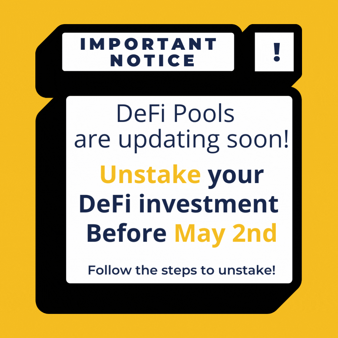 #### 🚨 Action Required 🚨 Unstake your DeFi investment before⏰ **May 2nd (GMT+8)**. The both pools are going to update soon. After the pools are updated, we'll reopen the pools for staking. Just keep eyes on our new announcement here. **Follow the steps in the short clip to unstake** If you encounter any issue during unstaking, just contact our customer service or directly reach out us in Discord (https://discord.gg/xhgbrtxZA6)