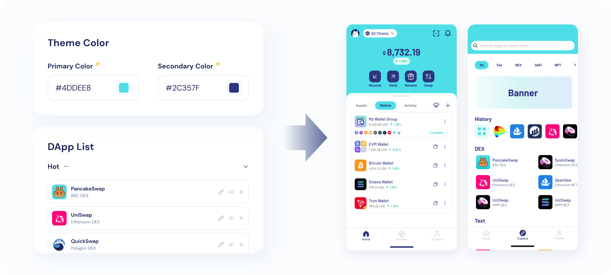 In this view, you can review your wallet settings, change your wallet theme color, add your community and support links, add your own DApps, and more.