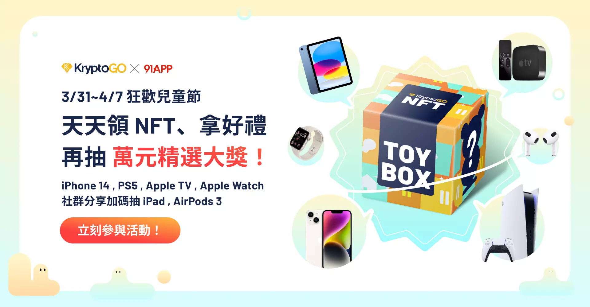 嘿嘿嘿,原來NFT這麼簡單~好好玩『KryptoGO 和 91APP 』聯名舉辦的 NFT 活動,免費送出 80,000 份玩具盒 「玩具盒 NFT」,中獎率高達 100%, 可至品牌官網換優惠,品牌包括『野獸國、萬年東海模型、Norns、快車肉乾和歐可茶葉(最高有 1000 NTD 優惠)』參與者還可享 iPhone 14、PS5 和 AirPods 等多項大禮之抽獎資格。